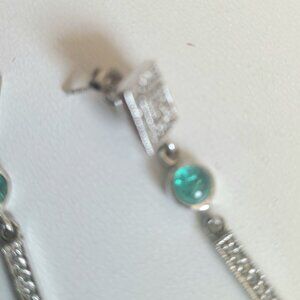 Long dangling sterling silver earrings with pink and green rhinestones.