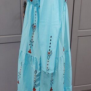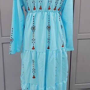 Long light blue dress printed with an ethnic style design.