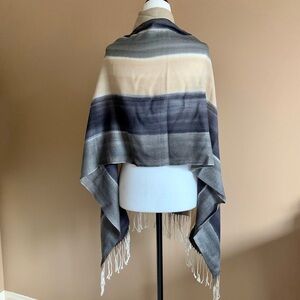 Long, tri-tone fringed wrap with bands of muted tan, charcoal and grey shades.