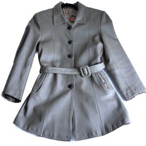 Vintage women's genuine leather coat in light grey. Features a matching belt with a rectangular buckle, notched collar, angled front pockets, and button-front closure. Size Small. Shows some minor wear on the edges but is overall in good vintage condition. Perfect for a retro-inspired look with modern styling potential.