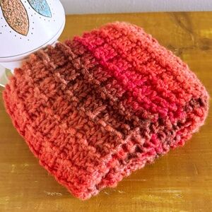 Long, soft, hand-knit scarf in Lion Brand's 'Sunset' colour-way yarn.