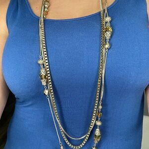 Long long chains are hard to find. Here's a great one. 3 chains linked as one with different links and coloured clear beads. Light yellow greenish stone, gold tone chains. Excellent vintage condition with no damage or wear detected. Add accessories, fine and fabulous or fashion and fun, to complete your look (some suggestions shown all listed and priced separately). Grab a new look, build a bundle, save a bundle! It's Fun getting Fresh with Lemon Squeezy Shop🍋