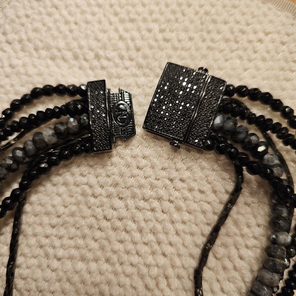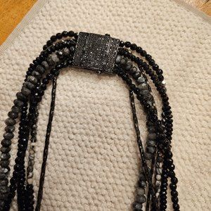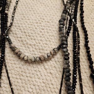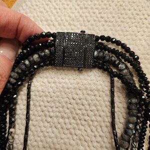 This beautiful necklace is made of natural stones. It is about 24 inches long with several layers. Black closure with crystal. A real statement piece.