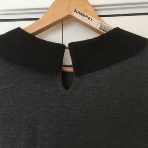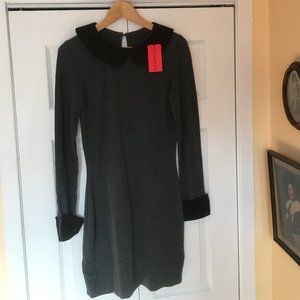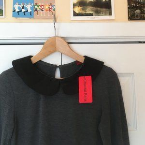 Very cute, stylish gray Peter Pan style dress with black rounded collar and cuff detail. 100% cotton, with stretch. Collar and cuff detail have no stretch, hold their shape well. Never worn, with tags on. Designer copy, purchased in Italy and can be worn on its own, or as a layering piece. 17" across the bust, with stretch and 31" from underarm to the hem.