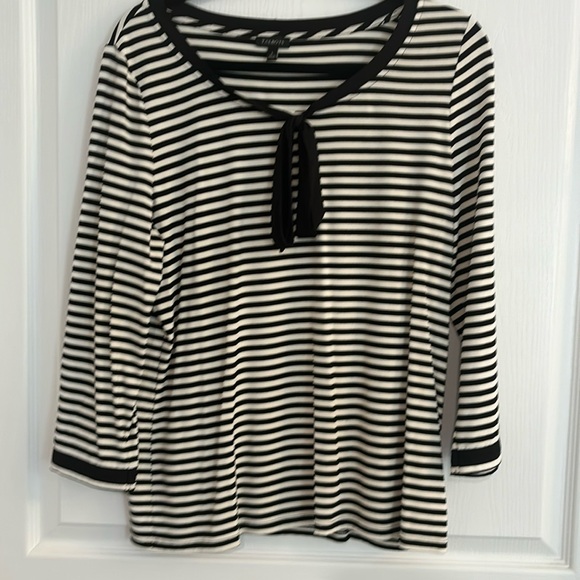 Very soft fabric with a little stretch. Tie bow can be adjusted. Can be dressed up or down. Only worn a few times.
