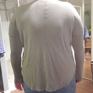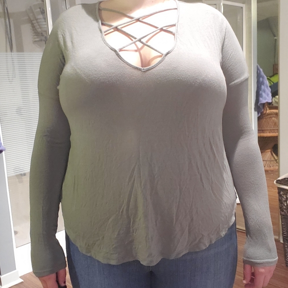 Green long sleeve shirt with cross front detail, stretchy fabric, good for fall to spring.