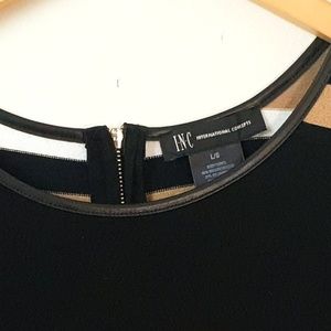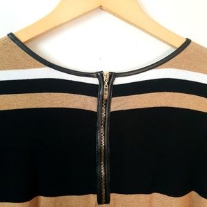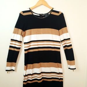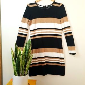 Description: Long sleeve stripped sweater dress - black, taupe and white flattering horizontal stripes