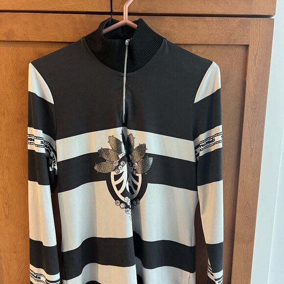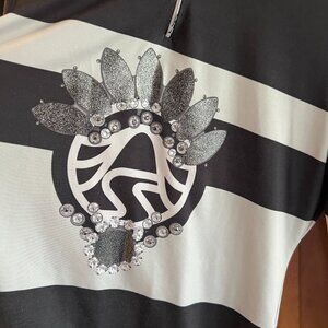 There are beautiful rhinestones : on the front and on the sleeves. There are a few tiny ones missing on one sleeve (see photo)