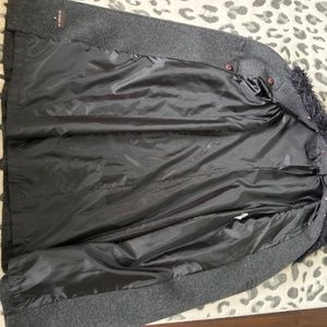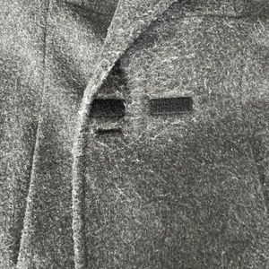 Long charcoal coat. Very light in weight. Velcro to close assisted by a hidden button.