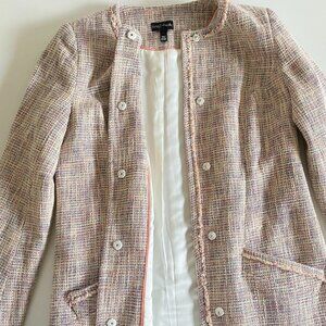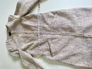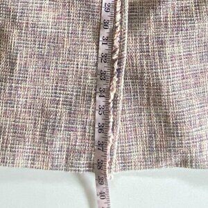 Absolutely Beautiful Spring, Fall Jacket! Sz 6-8 Long tall Sally Tweed pale pink, cream & blue favours a more lavender colour, Fringed trim, snap button closure, front pockets, fully lined, collarless with fringe accent. Jacket Fits Sz 6 and 8 Tall woman. Measurements: P to P: 19 1/4", / Waist: 18" / Sleeves: 26.5", / Shoulder to shoulder: 16.25" / Jacket Length: 39". In Excellent preowned condition, from a smoke free/pet free home.