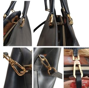 Details: Gold tone hardware. 3 separated compartments with a zipper on the inner divider compartment. Clasp closure. Double leather handles. Long leather strap. Bottom footings. Genuine leather. Made in France.
