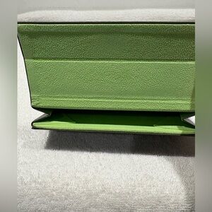Chic and functional, this authentic Longchamp folding eyeglasses case comes in a sleek olive green exterior with a vibrant lime green interior. Made with a sturdy structure and embossed with the Longchamp logo, it's the perfect slim profile for travel or everyday use. Excellent pre owned condition. Folds flat when not in use!