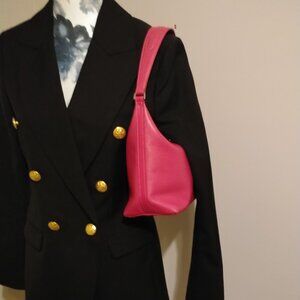 Eclectic mix of Quiet Luxury and Barbiecore. Pebbled-leather hobo bag has a lightly structured silhouette and flat base that won't puddle when you put it down. Convenient side pocket makes a perfect place to stash your keys for quick access. Gorgeous pink colour will add a pop of colour to all your neutral outfits and makes a bold statement with coordinating colours.