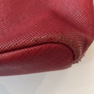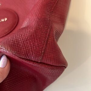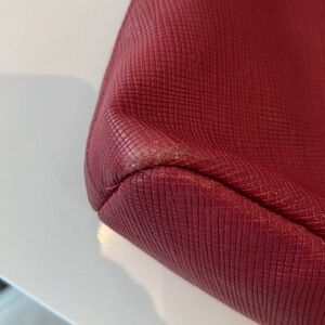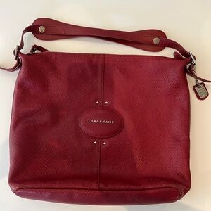 Saffiano leather shoulder bag in dark red. Adjustable shoulder strap. Some signs of wear on bottom corners but in otherwise very good condition. Longchamp dust bag included. 15” width, 12” length. Interior is immaculate.