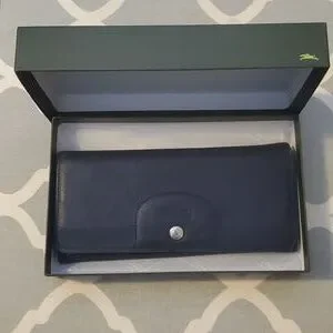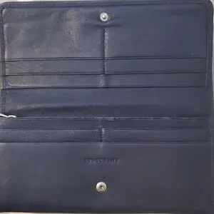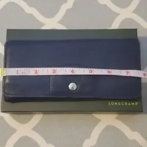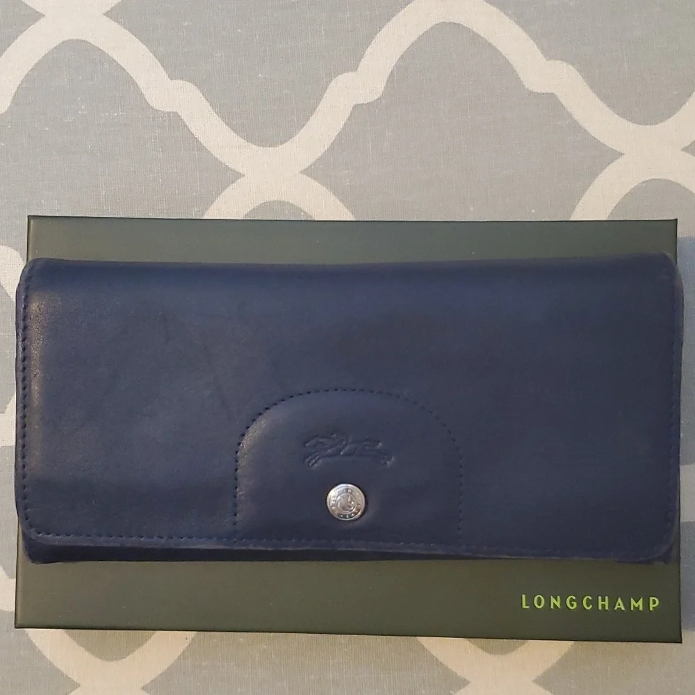 Well loved but taken good care of Longchamp wallet. Super soft 100% leather purchased in 2016 in Rome, Italy. I have loved using this wallet but ready to posh it on. Navy blue has 1 zipper enclosure, 5 compartments, and 6 card holder slots. Comes in its original box. Is in good used condition, please see all pics carefully. Wear on edges inside and outside corners. some surface scratches. Zipper still works perfectly.