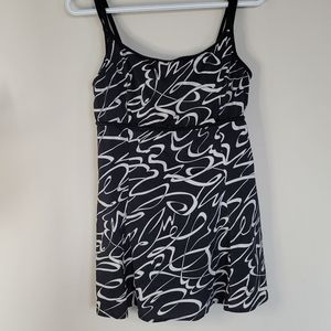 Longitude Swim Dress Suit One Piece Empire Waist Lined Black White Sz 12 EUC