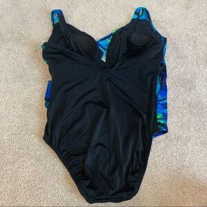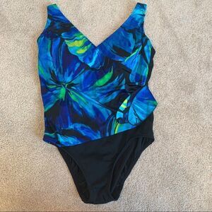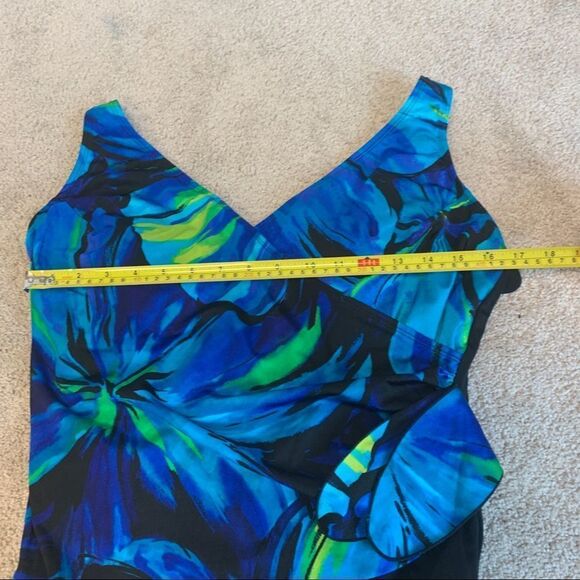 Longitude blue green side tie ruffle neckline one piece swimsuit Sz 16