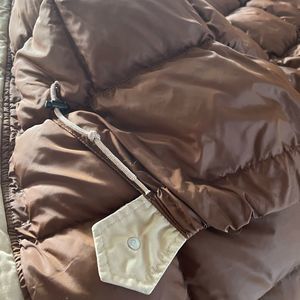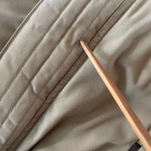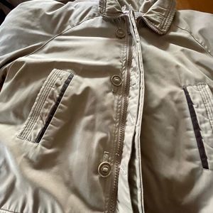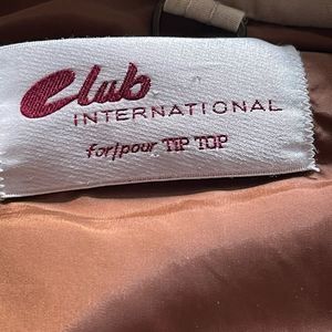 This heavy parka will keep you toasty warm on the coldest days. Made in Canada by Club International for Tip Top. The shell is 65% polyester and 35% cotton, the lining is 100% polyester and the interlining is 70% down and 30% waterfowl feather. It has a zippered front with a double button closure, 2 very generous front pockets, 2 breast pockets and a double sleeve pocket with room for pens. I am missing the hood and there is slight wear on the left sleeve and a small stain that I did not try to treat, see pics. The size tag is worn but I do believe it is an XL.