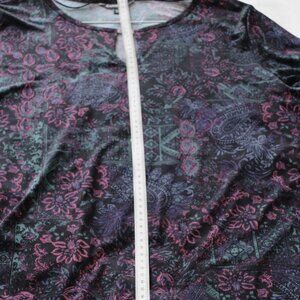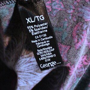 Silky-feeling long-sleeved top with a keyhole neckline and bohemian pattern in dark blues and purples. 95% polyester and 5% spandex; feels warm, yet light and close-fitting. By George.