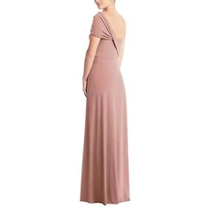 The lux jersey knit bandeau top dress features soft pleats opening into a fluid flared skirt.