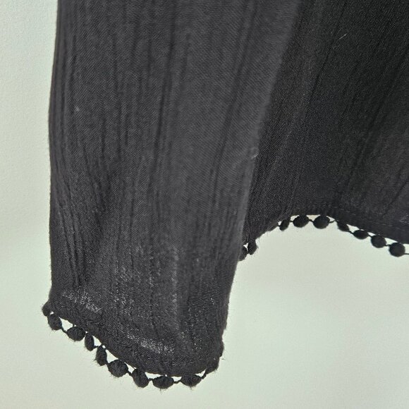 Pom-pom detailing on hem and sleeves, 3/4 length sleeves.