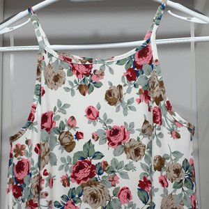 Loose and comfortable sleeveless dress. Flowers are pink & burgundy and beige & brown; Leaves are blue & grey on white background. Hardly worn so in excellent shape.
