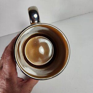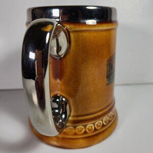 The tankard has embossed flower motives circling the base and silver handles and rims.