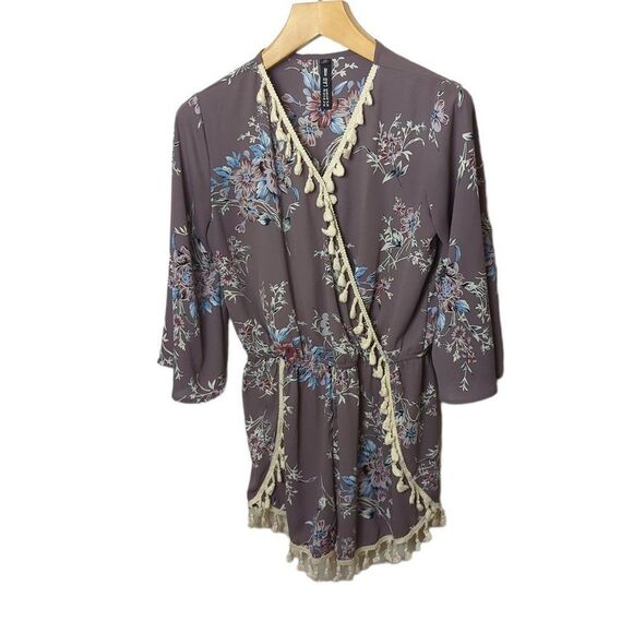This is a mauve purple floral print romper with pompom trim by Lord & Taylor's Design Lab line.