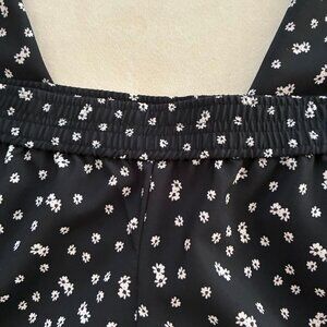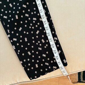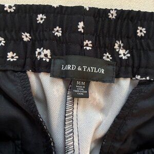 These Lord and Taylor pants are straight leg and size medium. They are black with cream design and have tuxedo seams down sides. Two pockets in front and two in back still stitched as purchased. Length is 32 inches with elastic type waist band. These look great with a black or cream top. Worn once.