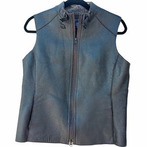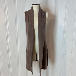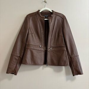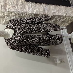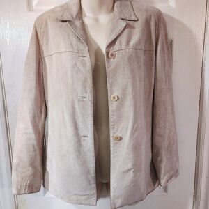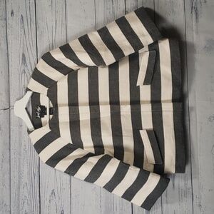 Unlined, collarless, long coat from Lord & Taylor is red cream blue & black. Excellent condition.