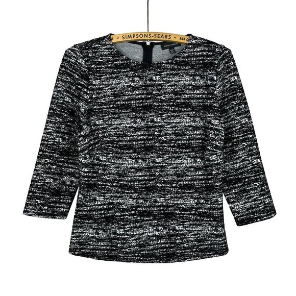 A timeless black-and-white textured blouse with 3/4 sleeves and a flattering crew neckline. Features a back zip detail for a modern finish. Made from a soft blend of 83% polyester, 15% rayon, and 2% spandex for comfort and ease of wear. Excellent pre-loved condition with no visible flaws.