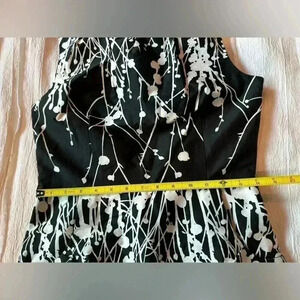 Flattering black dress with white floral pattern. Belt loops in the back (belt not included) fits a small belt (less than 1”).
