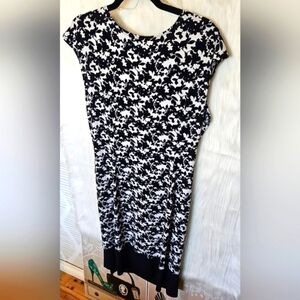 Timeless elegance meets modern detail in this floral midi dress from Lori M Collection. With a classic black and white print, flattering ruched design, and a sleek black banded bottom, it’s the perfect blend of structure and softness. The scoop V-neck adds a graceful touch, and having been worn just once, it’s ready to make a fresh impression.
