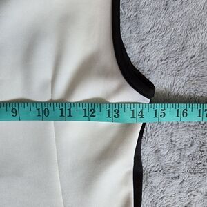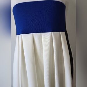 Sleeveless, A line midi fress. White bodice, a blue band at the waist, and a pleated white skirt. The neckline and armholes are trimmed in black, and there are black panels down the sides of the dress.
