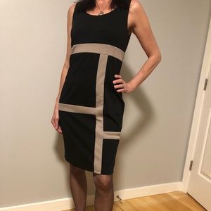 LoriM Collection Black/Tan Colour Block Dress Great for travel or office. This dress is very comfortable and in excellent pre-loved condition. Made in Canada.
