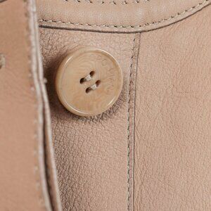 Made in Italy, this jacket from Loro Piana is crafted with a dyed lamb in an Ecru beige, and features 3/4 sleeves, a crewneck, hidden front button closures, front patch pockets, a cropped rounded hem, and shearling lining.