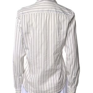 Channel office siren energy with this Loro Piana striped button-up in ecru and blue. Cut from a soft cotton blend, it balances sharp tailoring with subtle allure — perfect half-tucked into a pencil skirt or left undone over wide-leg trousers. Light wash wear and a few loose threads add to its lived-in charm while keeping its polished edge intact.