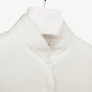 Made in Italy, this shirt from Loro Piana is crafted in a white linen, and features long sleeves, buttoned cuffs, a mandarin collar, front button closures, a rounded hem, and eyelash fringing on the cuffs and neckline.