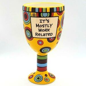 Lorrie Veasey's Our Name is Mud Ceramic Social Drinker Wine Goblet by Enesco-Front: "I'm Not A Social Drinker"; Back: "It's Mostly Work Related". EUC & no signs of chips, cracks, scratches or crazing. Approx. size: 5.5" (w) x 3.5" (l) x 7" (h). This colourful eye-catching goblet is sure to make drinking wine fun. The bright & sturdy ceramic material are some of the things you get with this whimsical goblet. Relax and enjoy your favorite wine in this wise yet fun ceramic glass.