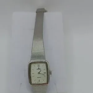 Stylish Lorus watch with a silver band and rectangular white face. Features quartz movement. Mov't Dial Japan