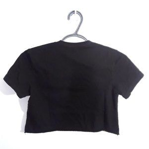Black cut off crop top with white text. Short sleeves. Casual style.