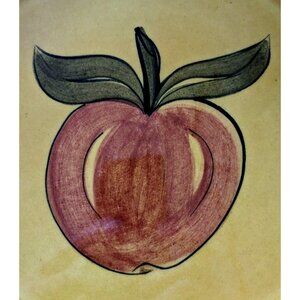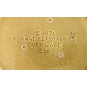 Description : round , scalloped edge, hand painted apple and leaves. Made of ceramic, glazed finish. Signed 1971. Los Angeles Potteries Ovenware. 630. W.