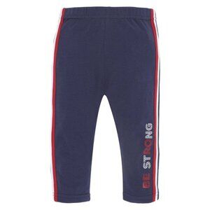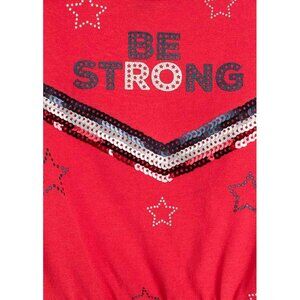 Vibrant two-piece set for girls featuring a red tunic top with sparkling star details and motivational 'Be Strong' slogan. The top includes a stylish cinched waist and convenient pockets. Paired with navy leggings accented with red and white side stripes and matching text detail, this ensemble is perfect for active days and offers both comfort and style.