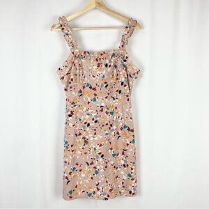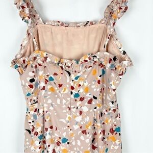 The Lost + Wander Santa Rosa Blush Print Ruffled Mini Dress is the playful, cute dress we have been looking for! Sleek woven fabric boasts an abstract white, red, orange, teal blue, and black print across the princess-seamed bodice. The square neckline and adjustable shoulder straps have ruffled trim while a fitted waist tops a flirty mini skirt. Hidden back zipper/clasp. Size tag is missing but it fits like a medium, see measurements for fit (garment has no stretch).