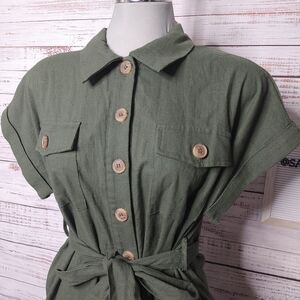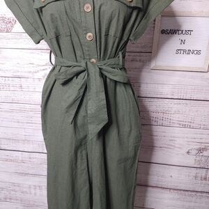 The Crescent Moon Jumpsuit is a great spring style. This classic fit jumpsuit features a button up front and fabric tie belt as well as 2 front pockets. It is made of a nice linen blend to keep you feeling cool on your adventures. Hand Wash. Color: Green. Runs true to size