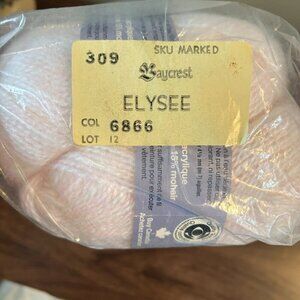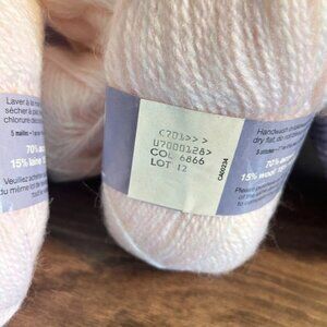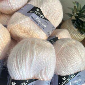Lot of 10 skeins of vintage Baycrest knitting wool in the soft and elegant Elysee baby pink colorway. Each skein is 50g and made of a cozy, durable blend of 15% Mohair, 15% Wool, and 70% Acrylic.