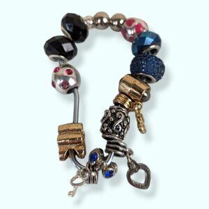 This lot includes 16 bracelet charms as well as the metal ring pictured. Please note there are two sizes of beads: the larger beads will fit on a Pandora-style bracelet, while the smaller beads will fit on a bracelet that is the same width as the wire it's on. The charm beads are in different styles and made of different materials, but I don't believe any are stamped. If I find any other loose similar charm beads, I will include them when this ships.