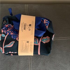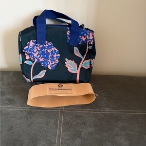 Black floral cosmetic bag with handles. Size 8.5”x6.5”x4”.