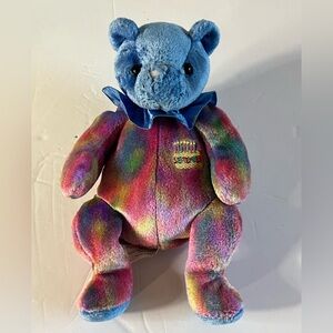 Celebrate your birthday or gift someone special with this charming pair of vintage Ty Beanie Boppers Birthday Bears. Each bear features a vibrant tie-dye plush design with embroidered birthday cakes showcasing the months “August” and “September.” The bears are dressed in festive ruffled collars (green for August and blue for September), adding a whimsical touch to their cheerful appearance. A collectible duo perfect for plush lovers, birthday celebrations, or nostalgic keepsakes!