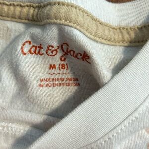 Five tshirts in great, used condition, assorted brands. Includes one Gap tshirt with “distressed” image of car and surfboard, three Old Navy shirts with sayings and Mario, and one Cat & Jack shirt with beige camo print.